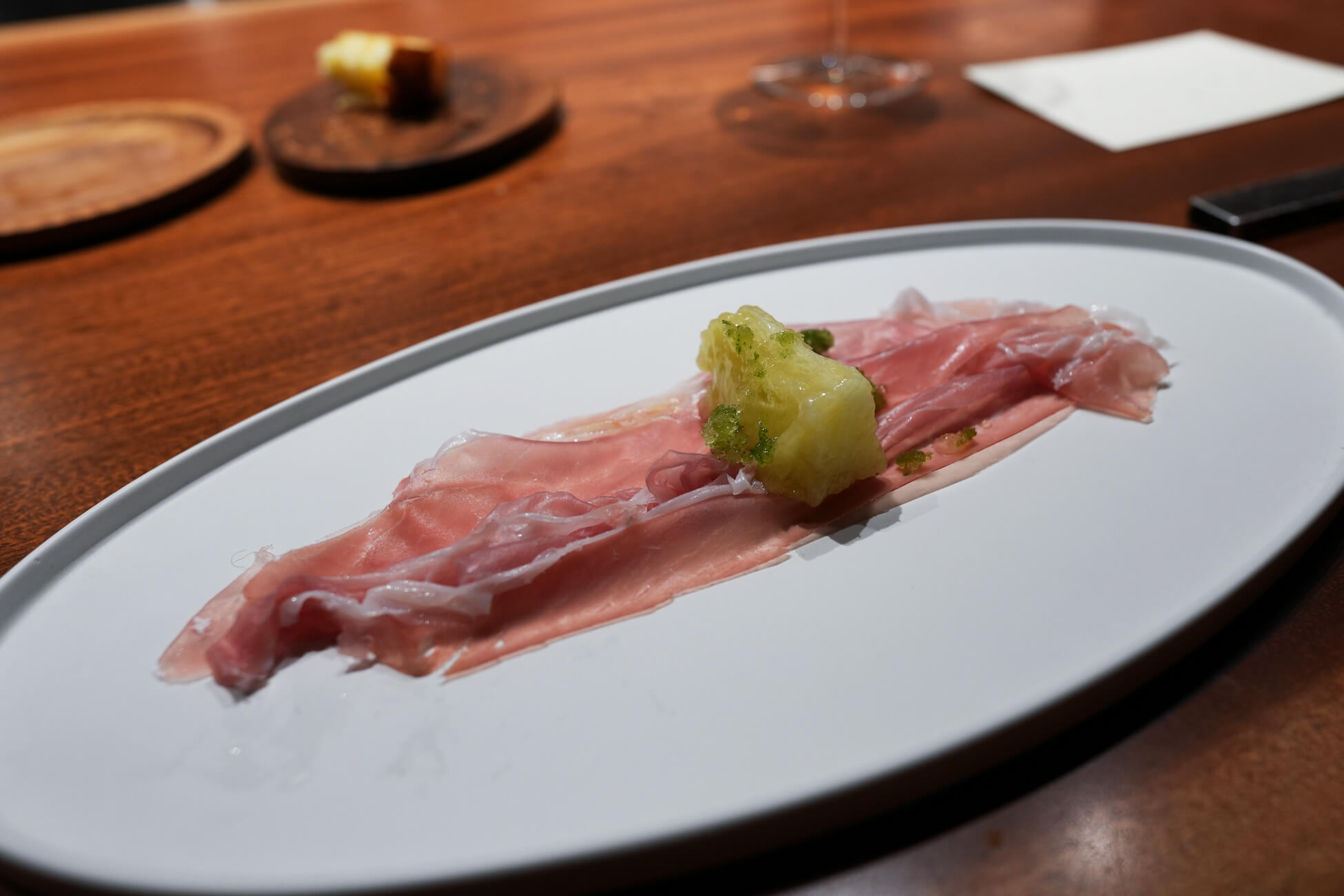 ピスタチオペーストの酸味のあるソースに、冬瓜スライス、梨のソテーという面白い組み合わせ。