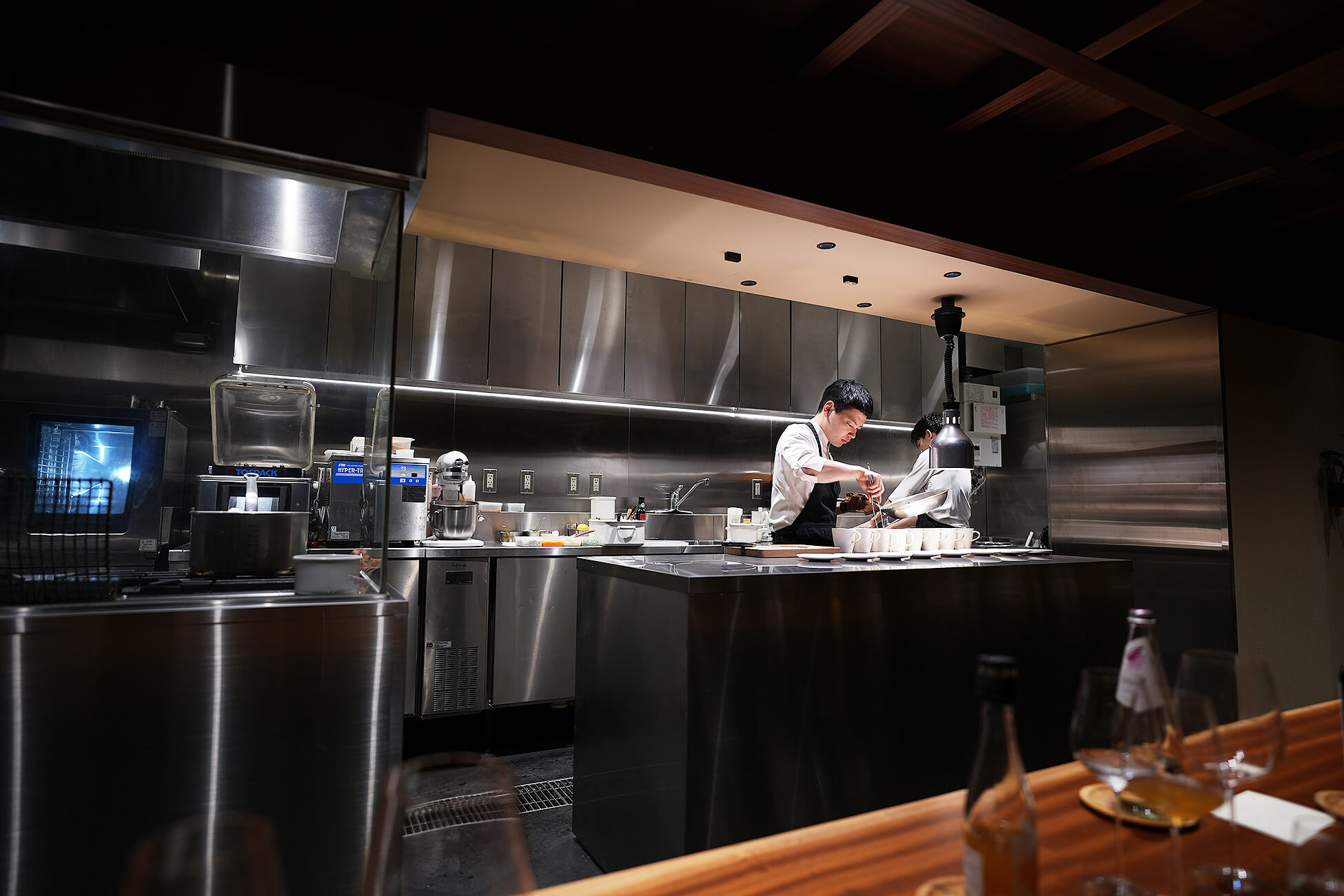 フルオープンキッチンに面した一枚板のカウンター8席と、6席の個室という構成。
