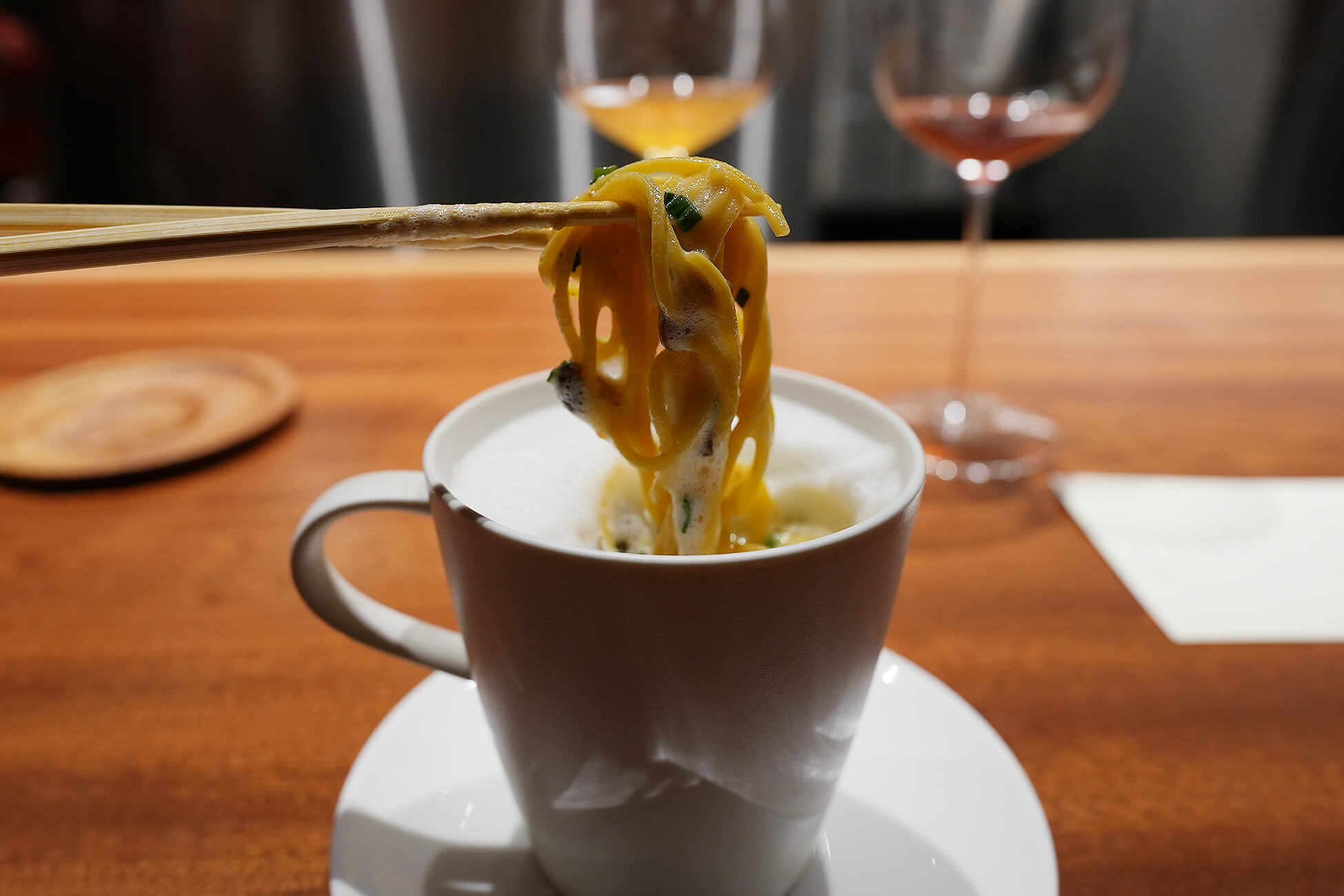 締めのパスタは、遊び心満載の“カプチーノ”スタイル。